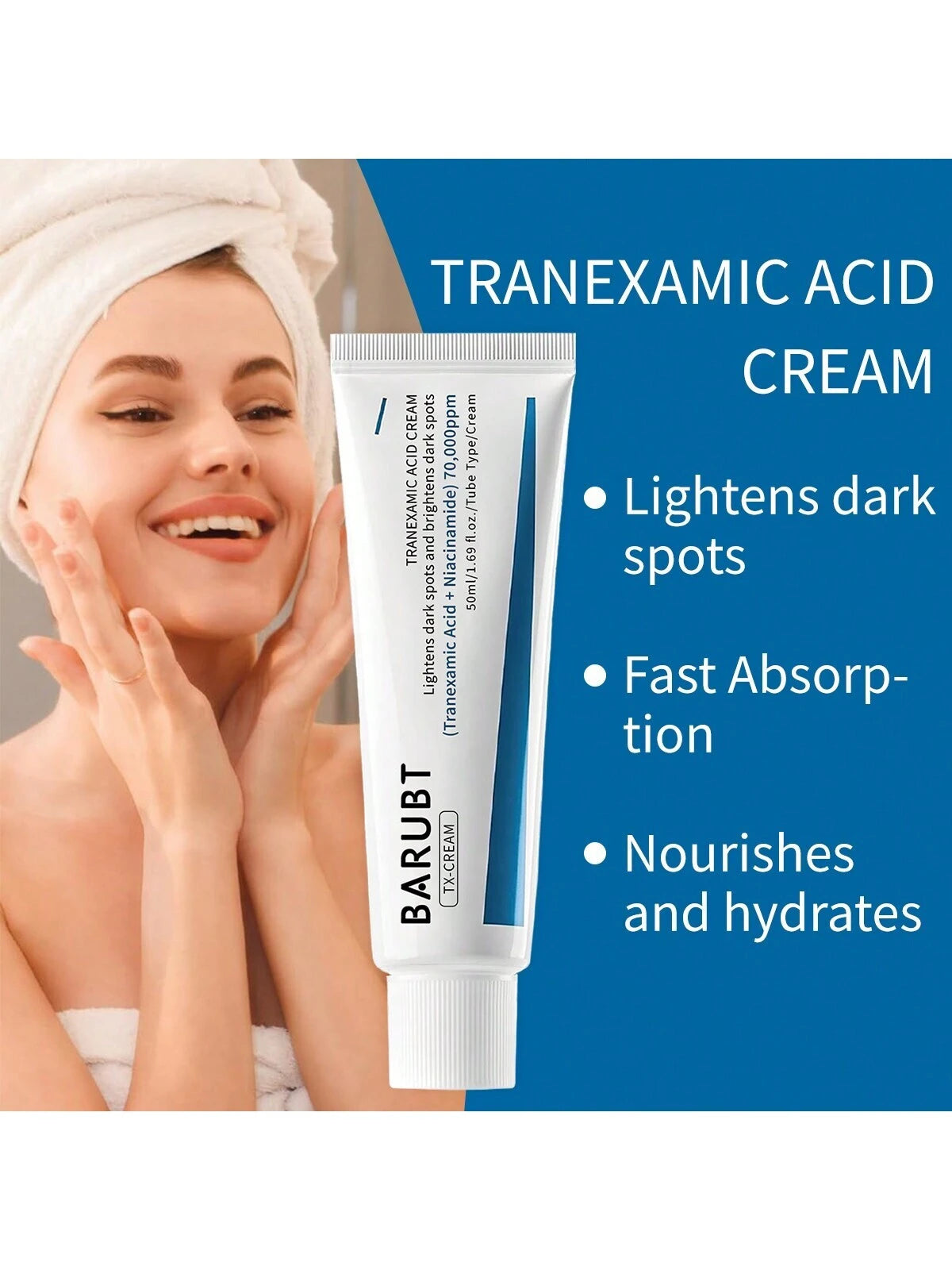 Brighten and revitalize your skin with BARUBT Tranexamic Acid Cream. This 50ml cream targets skin spots, freckles, and acne marks, leaving your skin radiant, elastic, and smooth.